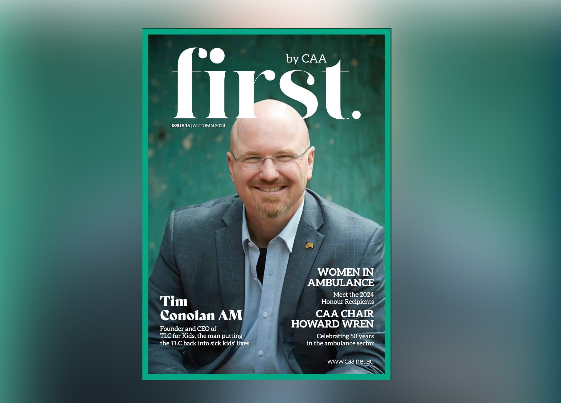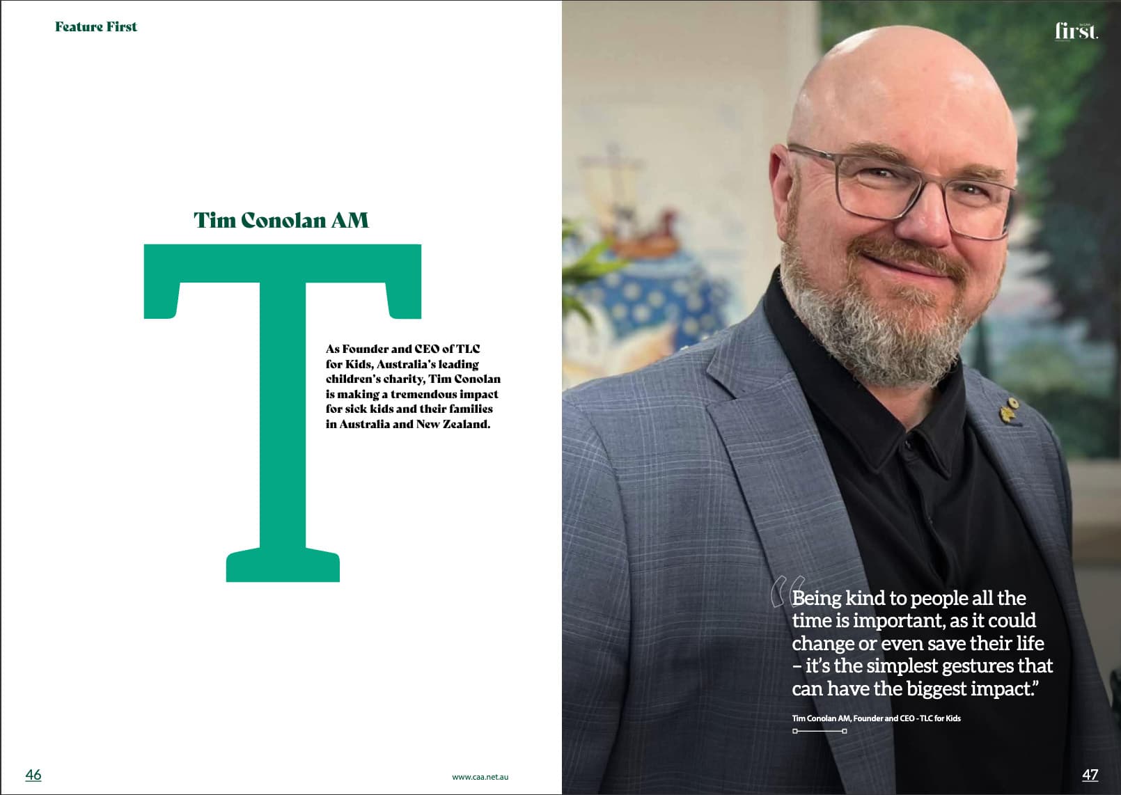 FIRST Magazine by the Council of Ambulance Authorities has proudly featured Tim Conolan AM on the cover of their Issue 15 | Autumn 2024 edition. In this insightful interview, Tim Conolan, co-founder of TLC for Kids, shares his inspiring journey of creating a profound impact on the lives of sick children and their families.