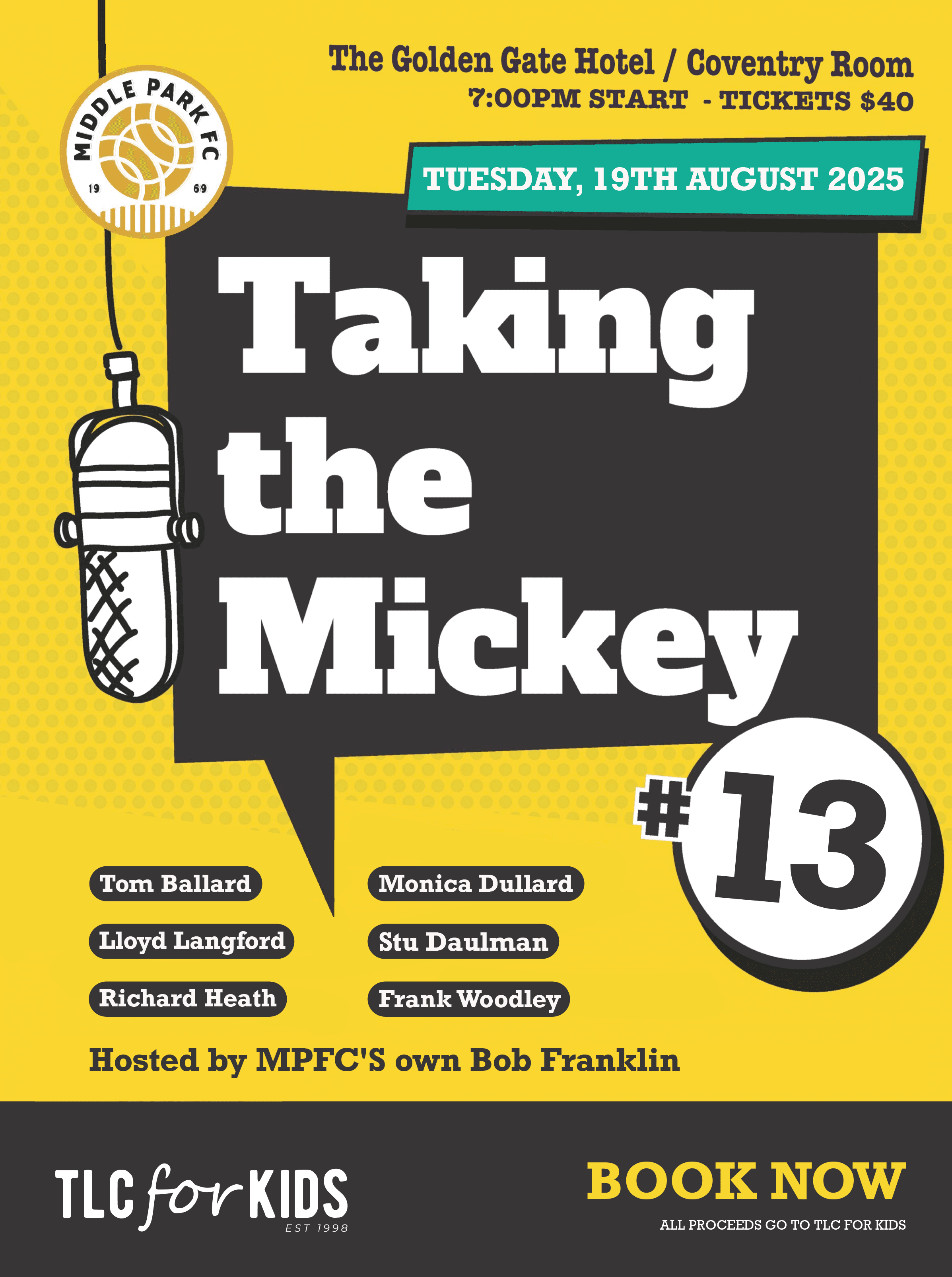 We’re thrilled to partner once again with the legends at Middle Park FC, whose support makes nights like this possible. Together, we’re turning belly laughs into real impact for sick kids and their families.